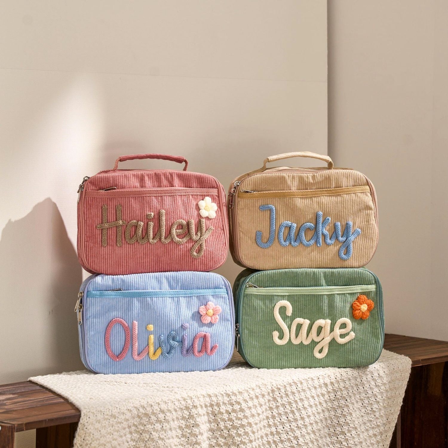 Make every meal special with our charming personalized corduroy lunch boxes! Crafted from soft yet durable corduroy fabric, these lunch boxes combine style, function, and a personal touch your child will love. Each box features custom stitched names in playful colors, making it easy to spot and impossible to lose.