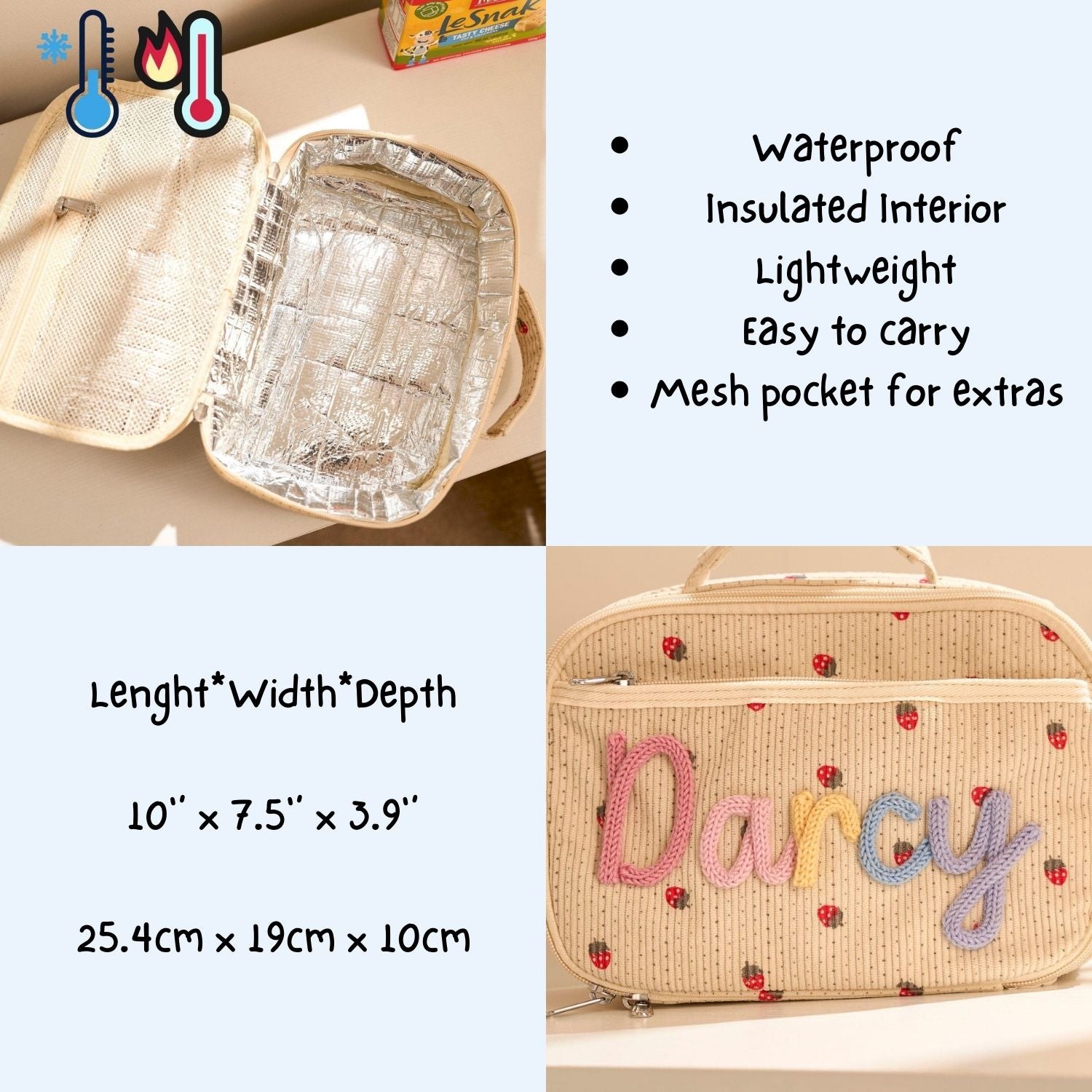 Designed with a spacious interior, a front zipper pocket for snacks or utensils, and a sturdy handle for easy carrying, this lunch box is perfect for school, picnics, or day trips. The lightweight design keeps it comfortable, while the personalization makes it truly one-of-a-kind.
