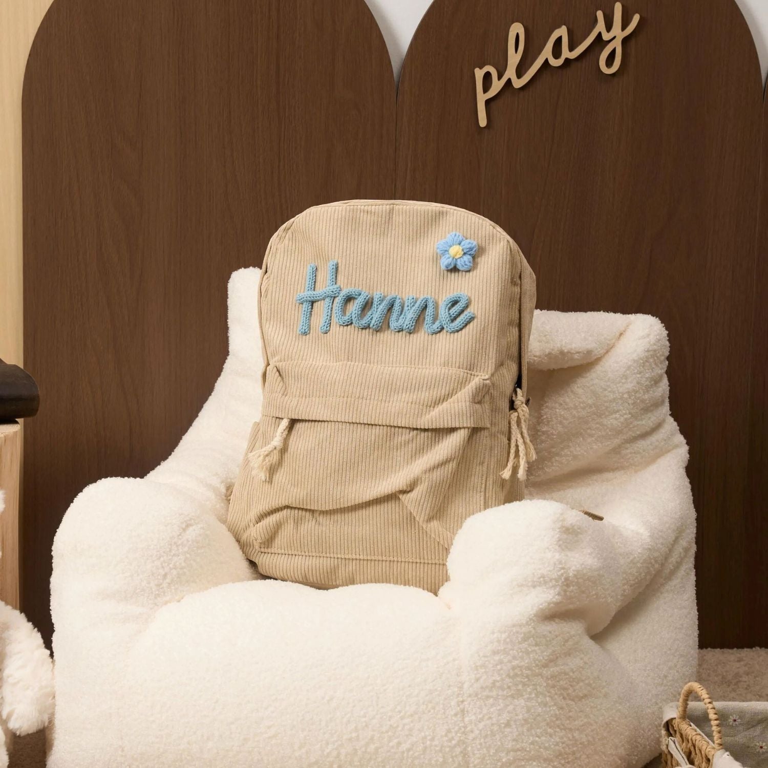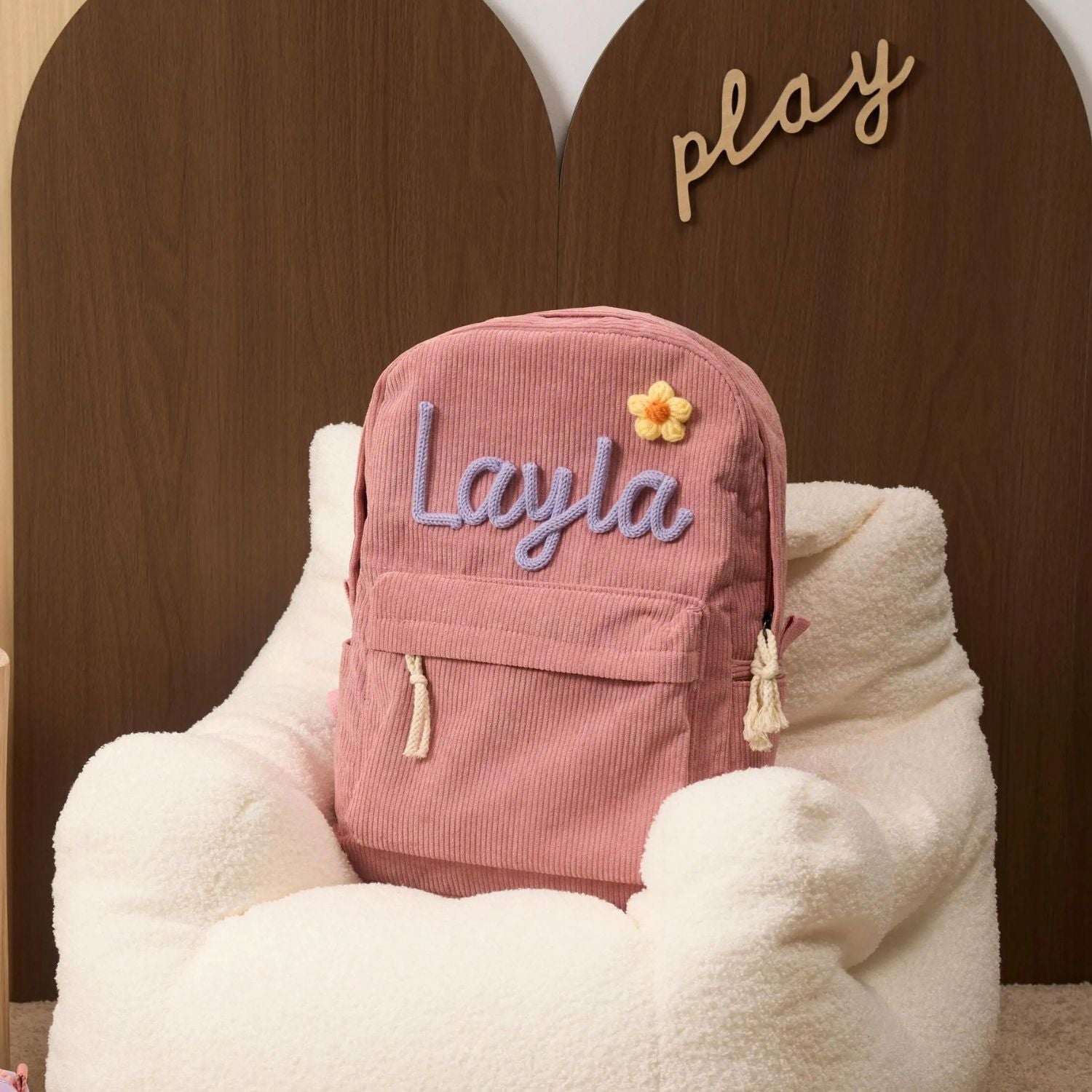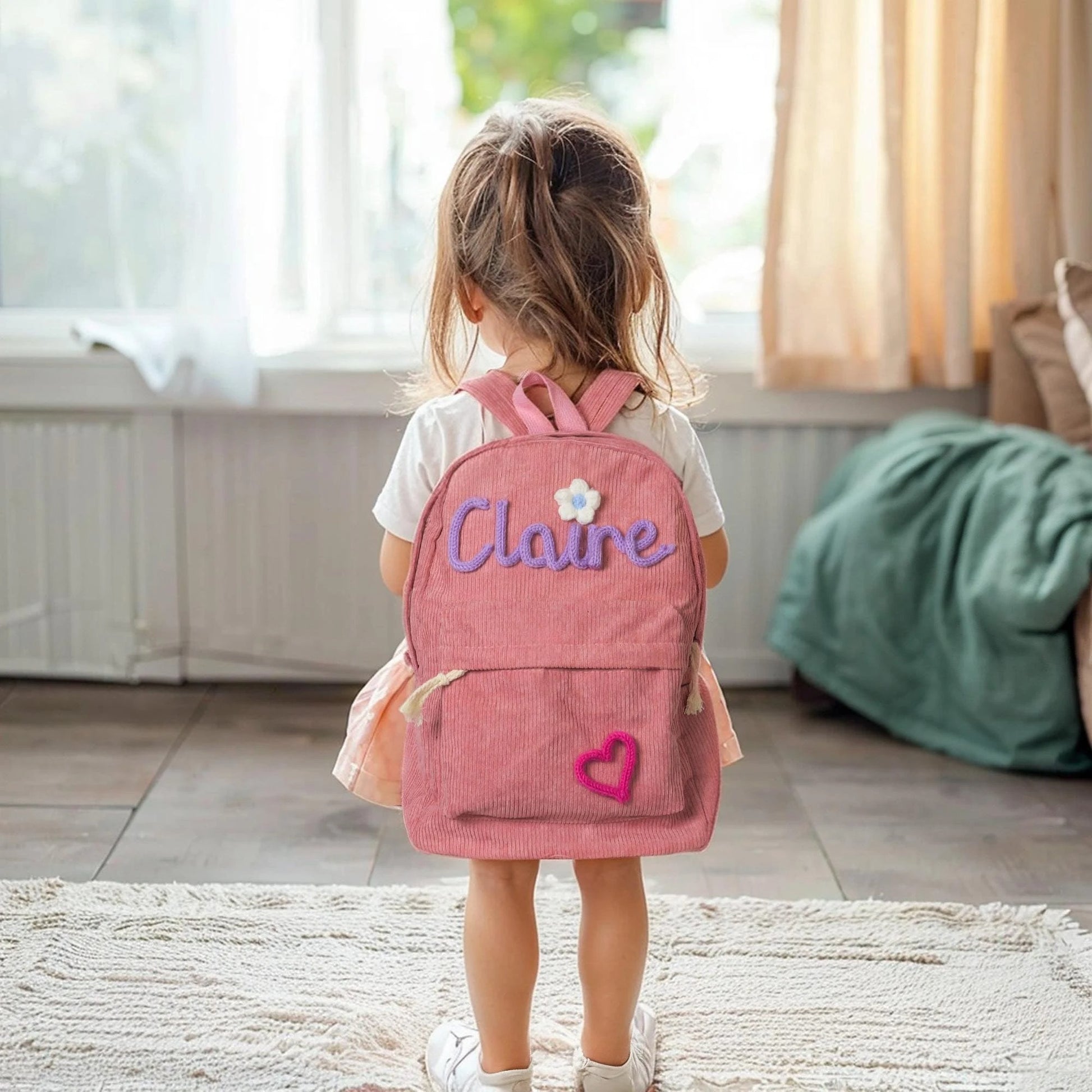 Make this school year unforgettable with our exclusive personalized backpacks, crafted to reflect your child’s unique style. Whether it’s for kindergarten, school, or everyday adventures, these handcrafted corduroy backpacks are designed to be both practical and special. They measure 15" x 11" x 5", offering the perfect balance of spacious storage and lightweight comfort. The corduroy texture adds a soft, cozy touch while still being durable enough for daily use.